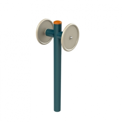 两人分别在转轮两侧向对方相反的用力方向推动转轮边缘,以相互较力锻炼上臂肌肉